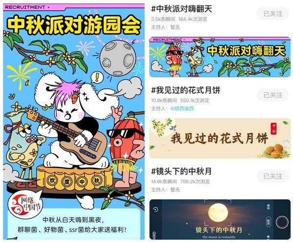 关于思念、团聚,年轻人也有各自的表达:Souler@西蒙彼得等主理人开办“趣味读文派对”,嘉宾们以中文、粤语读文轮番上阵,用声音温暖听众的耳朵;热爱K歌的年轻人则来到“歌房派对”,借“月”抒情,唱出美好祝福和浓浓乡愁;还有人相聚在游戏派对,体验趣味线上竞拍等活动,嗨玩在一起。